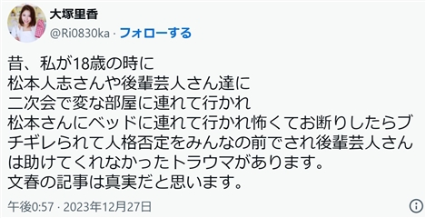 2023年12月26日、元グラビアアイドルで料理研究家の大塚理香さんが、松本人志の性加害についてXで公表しました。