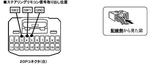 ステアリングリモコン信号取り出し位置は、20Pコネクタ(白)の3・4・5になります。