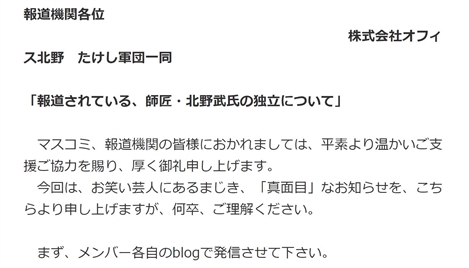 水道橋博士は2018年4月1日、自身のブログでたけし独立騒動を公表しました。