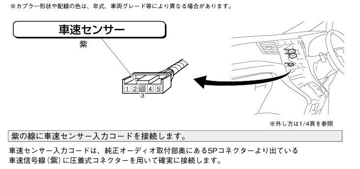 車速センサー入力コードは、純正オーディオ取付部奥にある5Pコネクターより出ている車速信号線(紫)に圧着式コネクターを用いて確実に接続します。