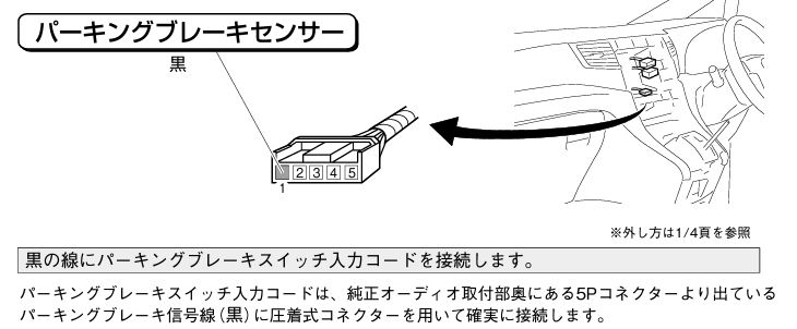 黒の線にパーキングブレーキスイッチ入力コードを接続します。パーキングブレーキスイッチ入力コードは、純正オーディオ取付部奥にある5Pコネクターより出ているパーキングブレーキ信号線(黒)に圧着式コネクターを用いて確実に接続します。