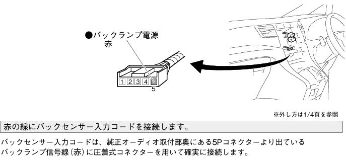 バックセンサー入力コードは、純正オーディオ取付部奥にある5Pコネクターより出ているバックランプ信号線(赤)に圧着式コネクターを用いて確実に接続します。