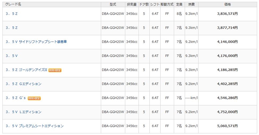 トヨタ ヴェルファイア 2008年5月(平成20年5月)〜2015年1月(平成27年1月) グレード一覧