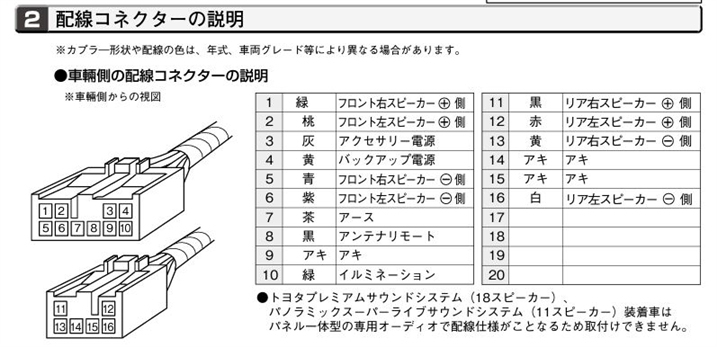 トヨタプレミアムサウンドシステム(18スピーカー)、パノラミックスーパーライブサウンドシステム(11スピーカー)装着車は パネル一体型の専用オーディオで配線仕様がことなるため取付けできません。