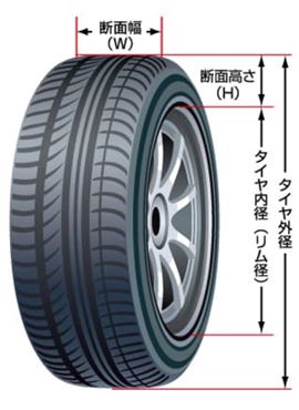参考までに、タイヤサイズの見方をご説明します。上記のタイヤのイラストをご覧ください。